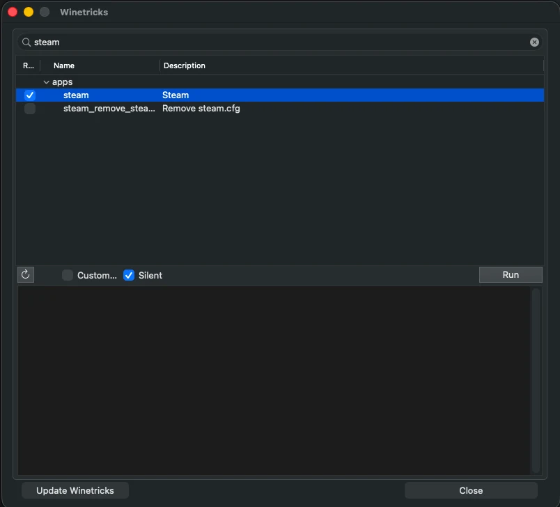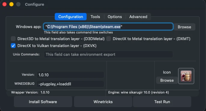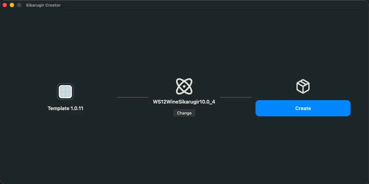 Now you can find the Sikarugir Creator in your /Applications folder. Open the application, select WS12WineSikarugir10.0_4 as Engine and create an application. Name this application for example Steam.app.